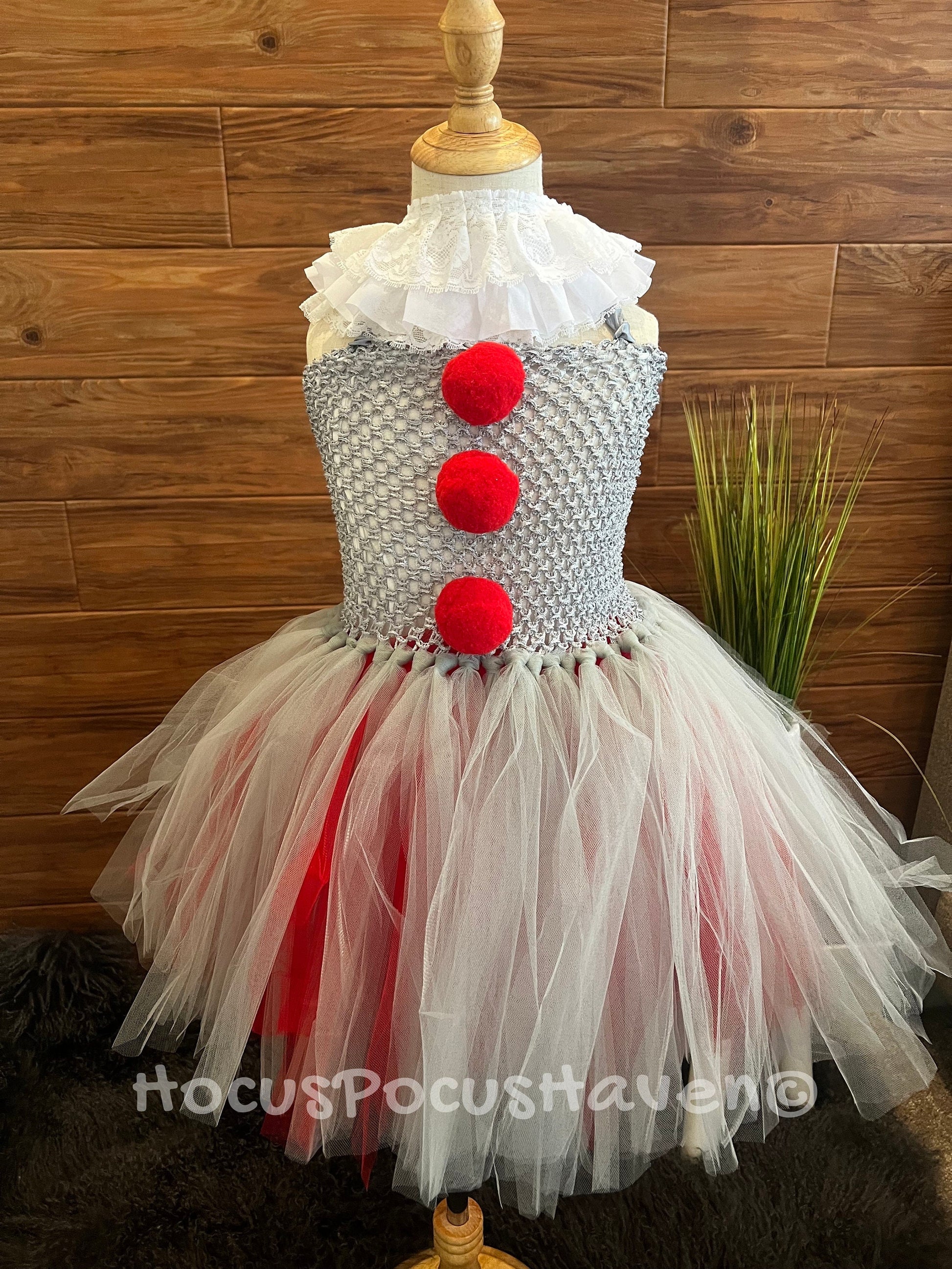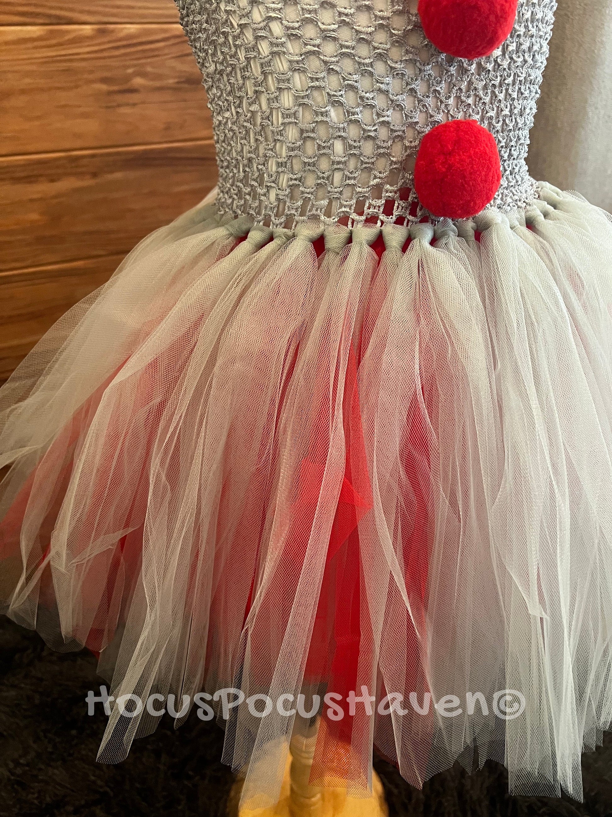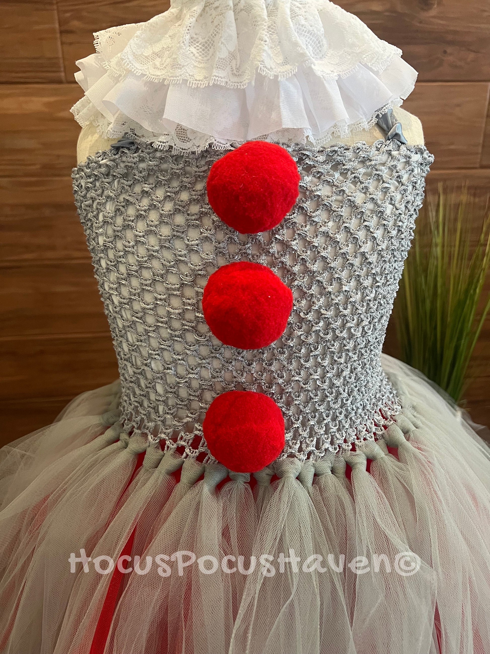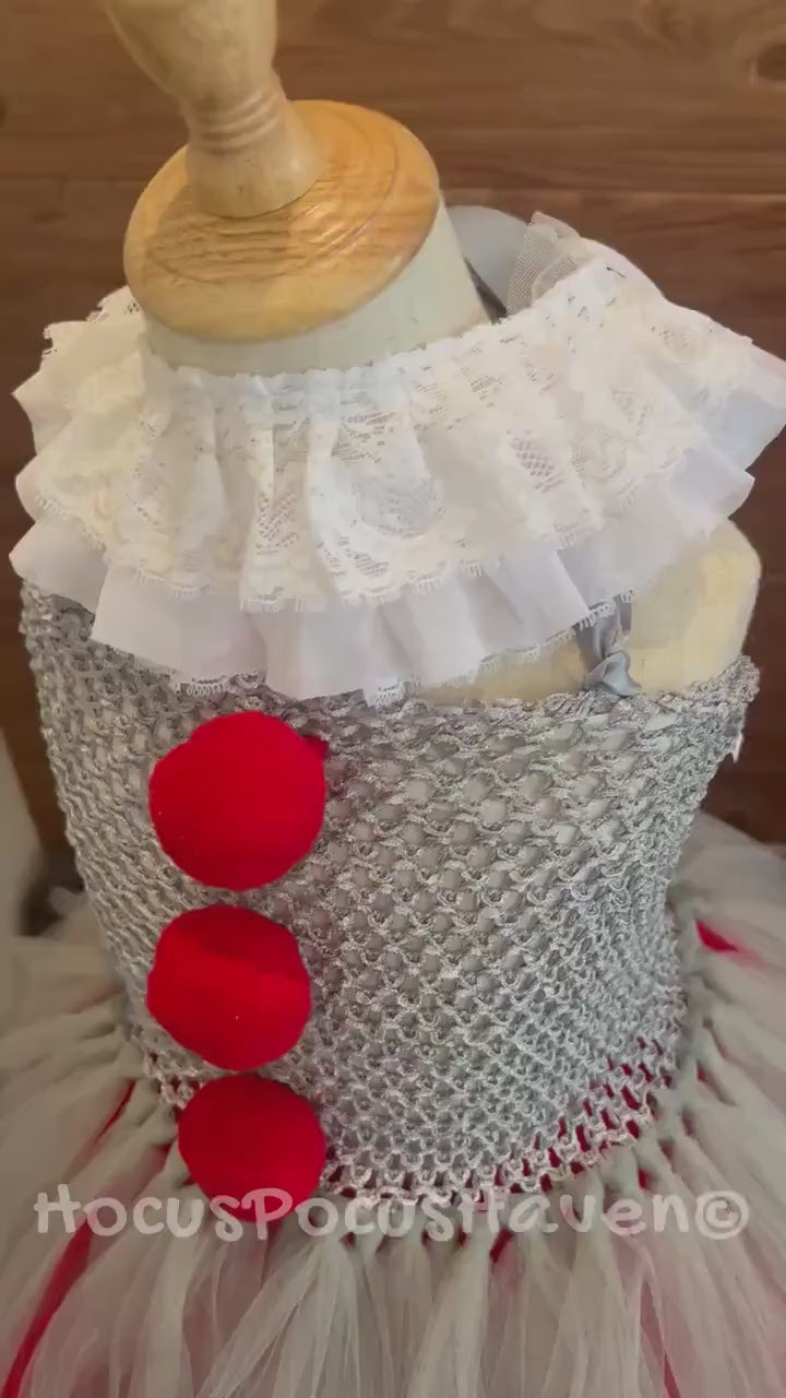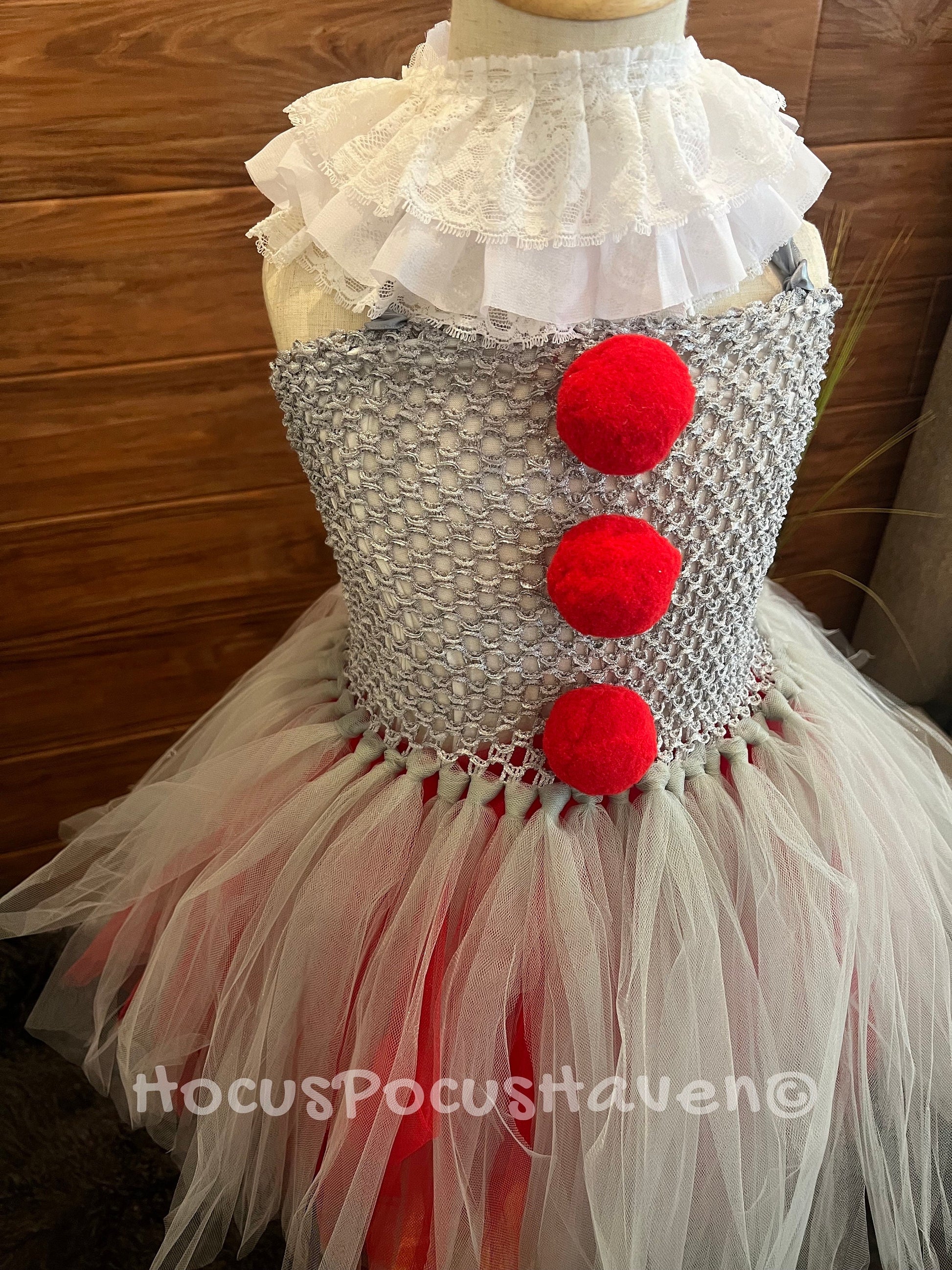 This costume is inspired by Pennywise, featuring a silver, white, and red tutu dress. The tutu skirt is layered, with a mix of silver and white tulle, creating a flouncy, playful look. The bodice is silver with red pom-poms running down the center, resembling Pennywise's iconic clown suit. A white ruffled Lee collar sits around the neck, adding a classic clown detail.