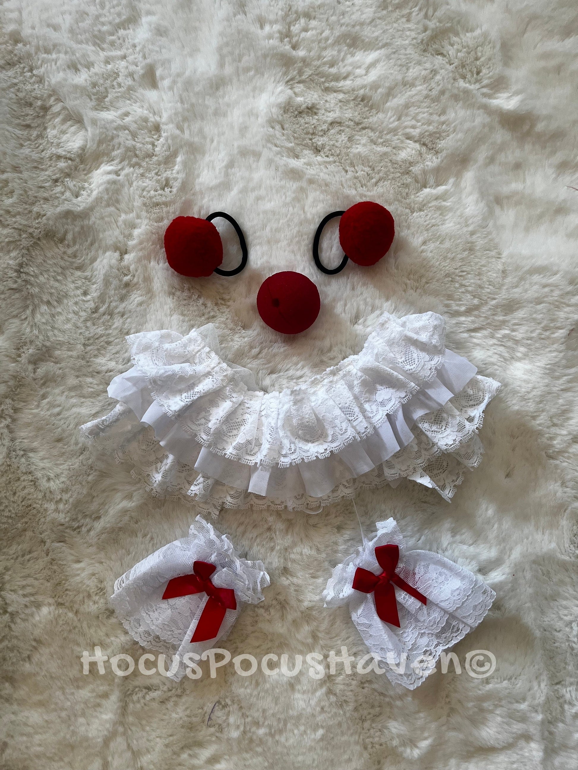 Accessories include a red clown nose, which can be switched out for a red ball for a more playful touch. The costume also features to red ball hair ties for hair. Does not include wig. To complete the ensemble, there are wrist cuffs made of white ruffled fabric, echoing the collar's design and adding to the eerie yet playful vibe.